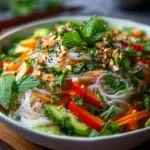 Lass uns über die Magie sprechen, die in diesem Salat steckt. Die zarten Reisnudeln, die wie kleine Wolken im Mund zergehen, werden nahtlos von buntem Gemüse begleitet: knusprige Paprika, saftige Karotten und erfrischende Gurken. Wenn du einen Bissen nimmst, spürst du den Crunch, gefolgt von der Frische der Kräuter – Koriander und Minze, die deinem Gaumen einen Hauch von Exotik verleihen. Und das Beste daran? Du kannst diesen Salat mühelos zubereiten und ihm mit deinen Lieblingszutaten eine persönliche Note geben.